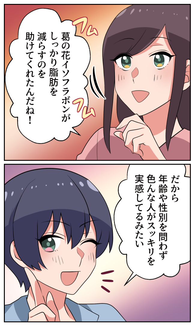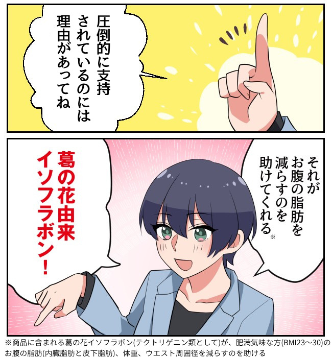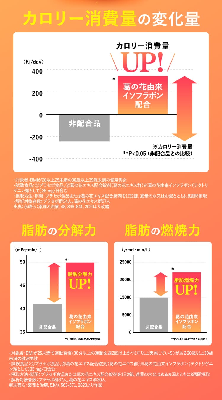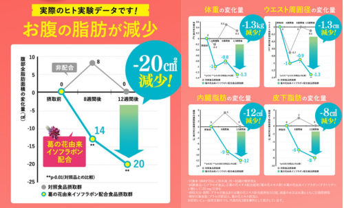 ・摂取方法・期間: プラセボ食品または葛の花エキス配合錠剤を1日2錠、適量の水又はお湯とともに12週間摂取