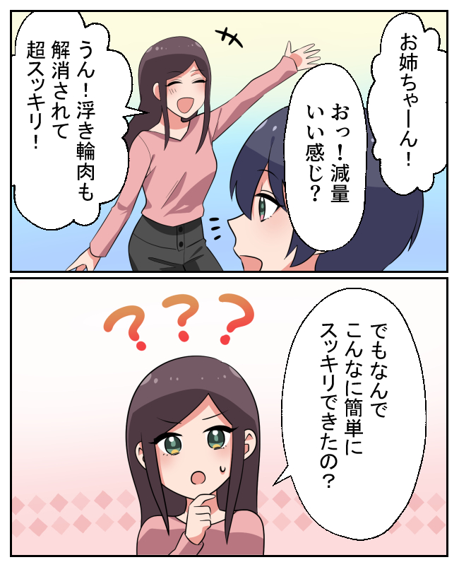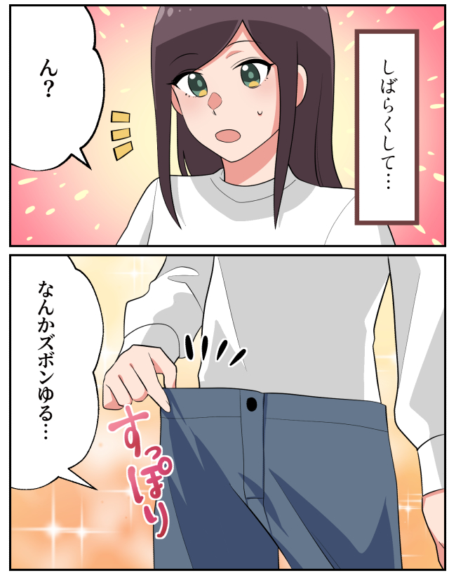 アラフィフになり様々なダイエットに挑戦するも変化なし…。身体のラインを隠しがちになっていましたがこの歳で理想の体型になれたのには驚きました。今では娘のズボンがはける程に。